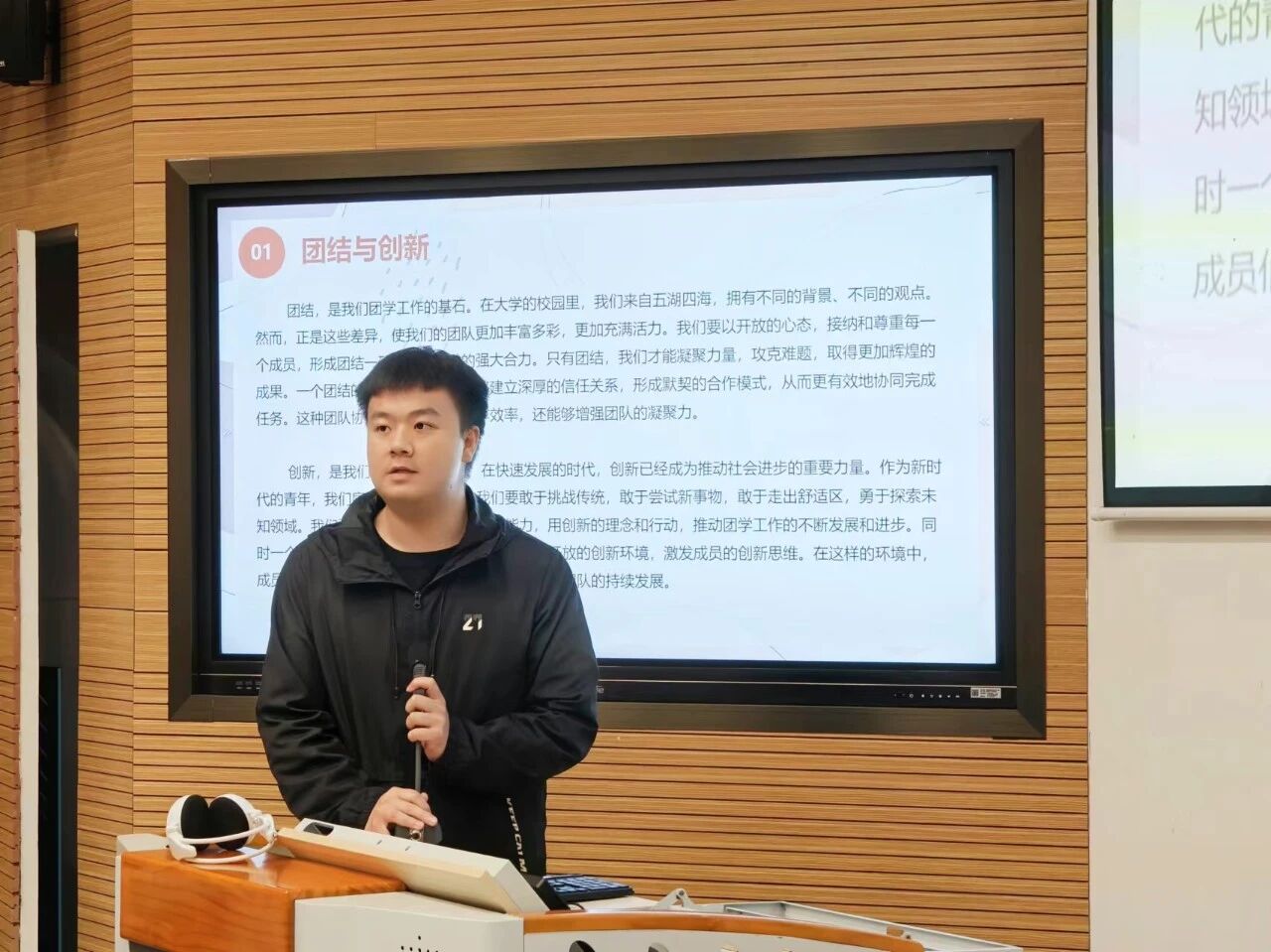 会议第三项由宣传部部长何东昊同学为团学成员进行了主题思想教育。本次思想教育主题为“团结创新,共筑未来”。团结与创新是相辅相成的,二者缺一不可,团结是我们团学工作的基石。身为团学的一份子,各成员应有着团结一心的信念,这样才能做好团学工作,维持团学正常运行。同时,创新也是团学工作的重要动力。在工作中大家都肩负重任,只有激发创新思维,提升创新能力,开创创新理念,才能够推动团学工作的不断发展和进步。何东昊同学强调了团学各部门间加强沟通协调,培养团队意识,营造积极向上的团队氛围,增强团队的责任感使命感。