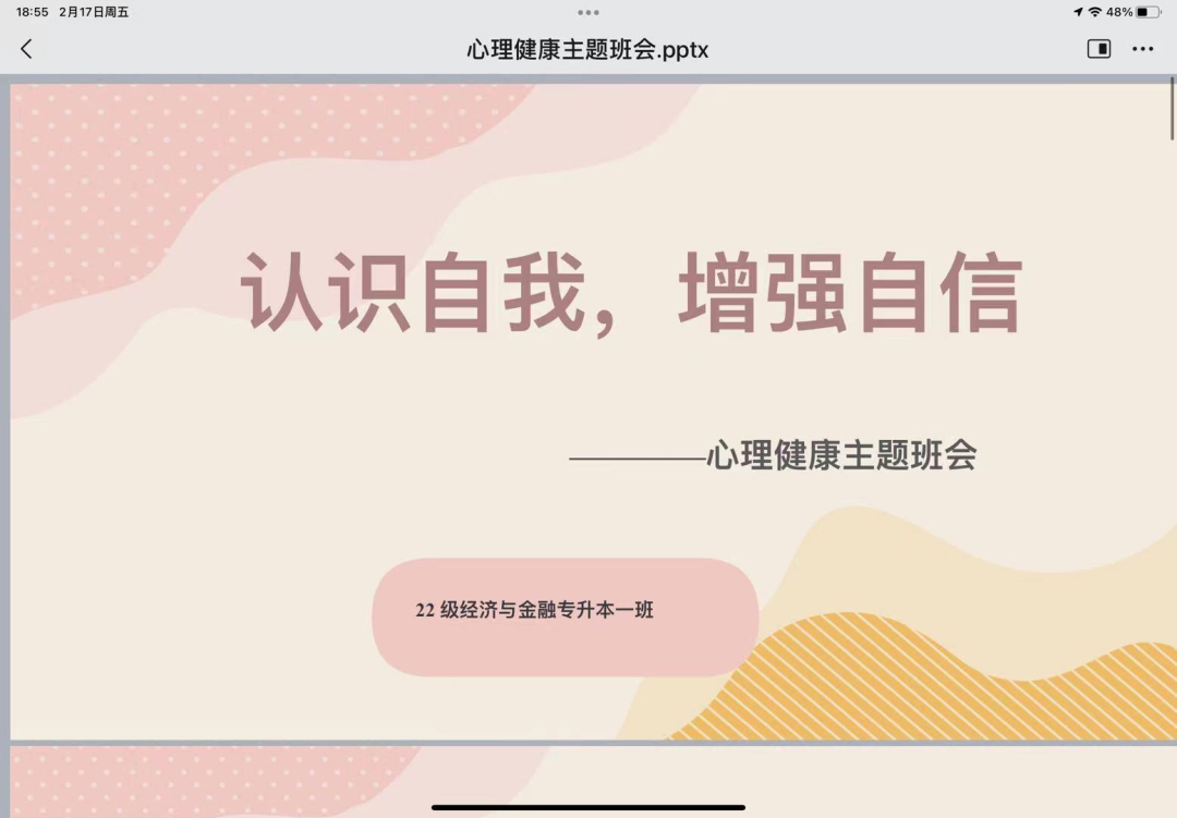 春已至,花盛开。我院本次的心理健康教育主题班会为今年的心理健康教育“第一课”,为下一阶段更好地做好学生心理健康教育工作提供了有力支撑。本次线上心理健康教育主题班会帮助学生缓解了部分学习压力,让他们能够以更自信、更健康的心态迎接接下来的学习生活。我院也将会持续关注同学们的心理健康状况,继续用行动把阳光送进学生的心灵之窗,为学生的健康保驾护航。新的学期来临,让我们一起从“心”开始,成就更好的自己!