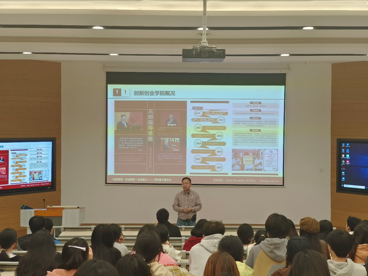 本次讲座由吉利学院创新创业学院产教融合中心、退役军人创业园、大创计划、学生知识产权负责人余何林老师讲授。余老师对创新创业学院概况、三创教育赋能、三创教育政策和三创能力塑造策略四个部分进行了讲解。