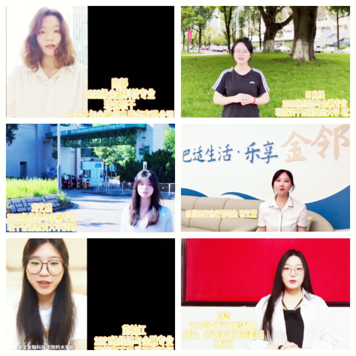 我院优秀毕业生代表陈静、田宸溪、刘艺棋、张艺萱、范柏江、吴桐、吕超世、彭思媛、郑兴月以视频的形式分享了她们在经济与金融专业的学习与成长经历、职业感悟,为新生提出了大学期间的规划建议,鼓励新生珍惜大学时光,努力学习专业知识,积极参与实践活动,不断提升自己的综合能力,为四年后走出校园做好充分准备。