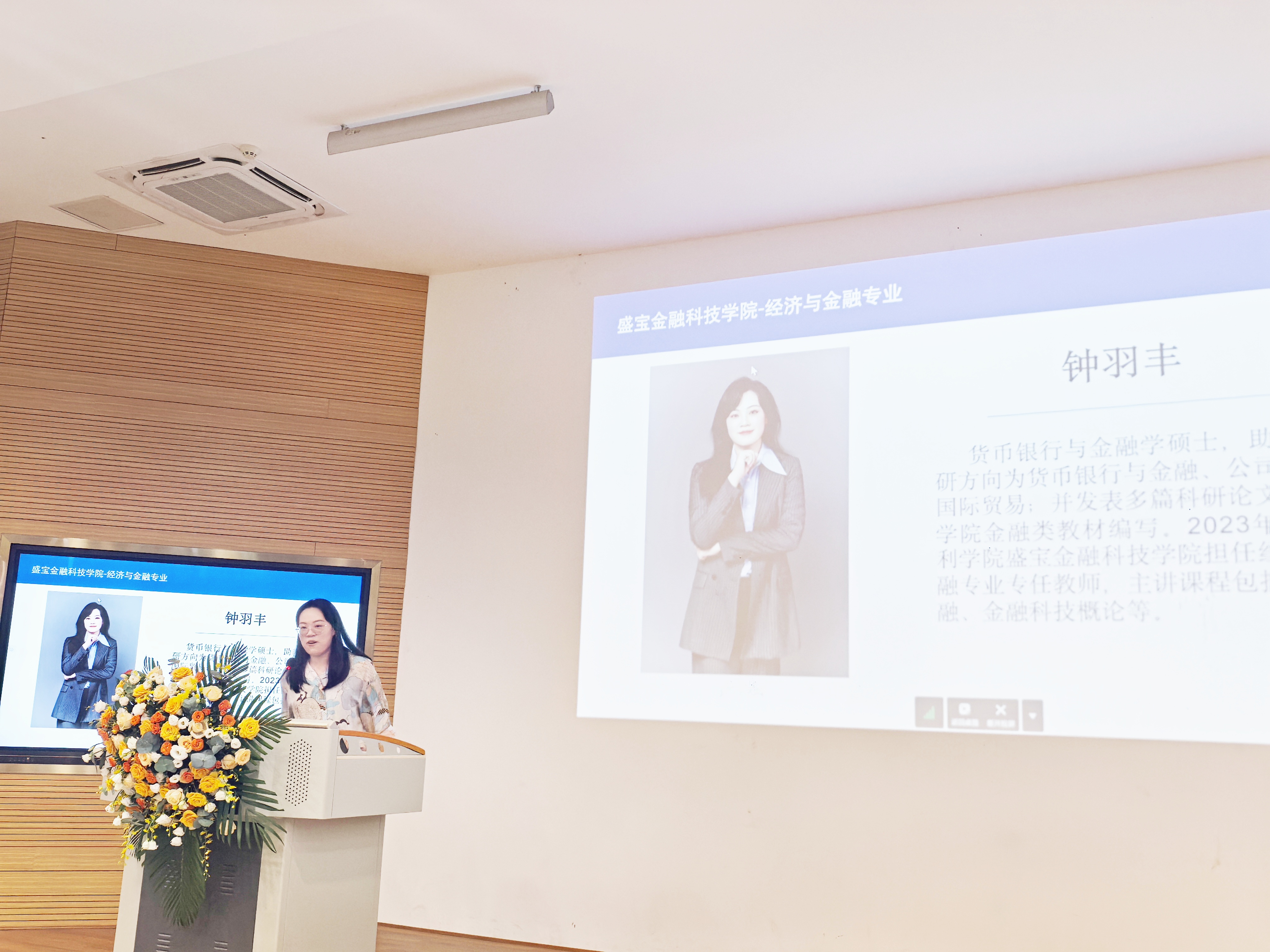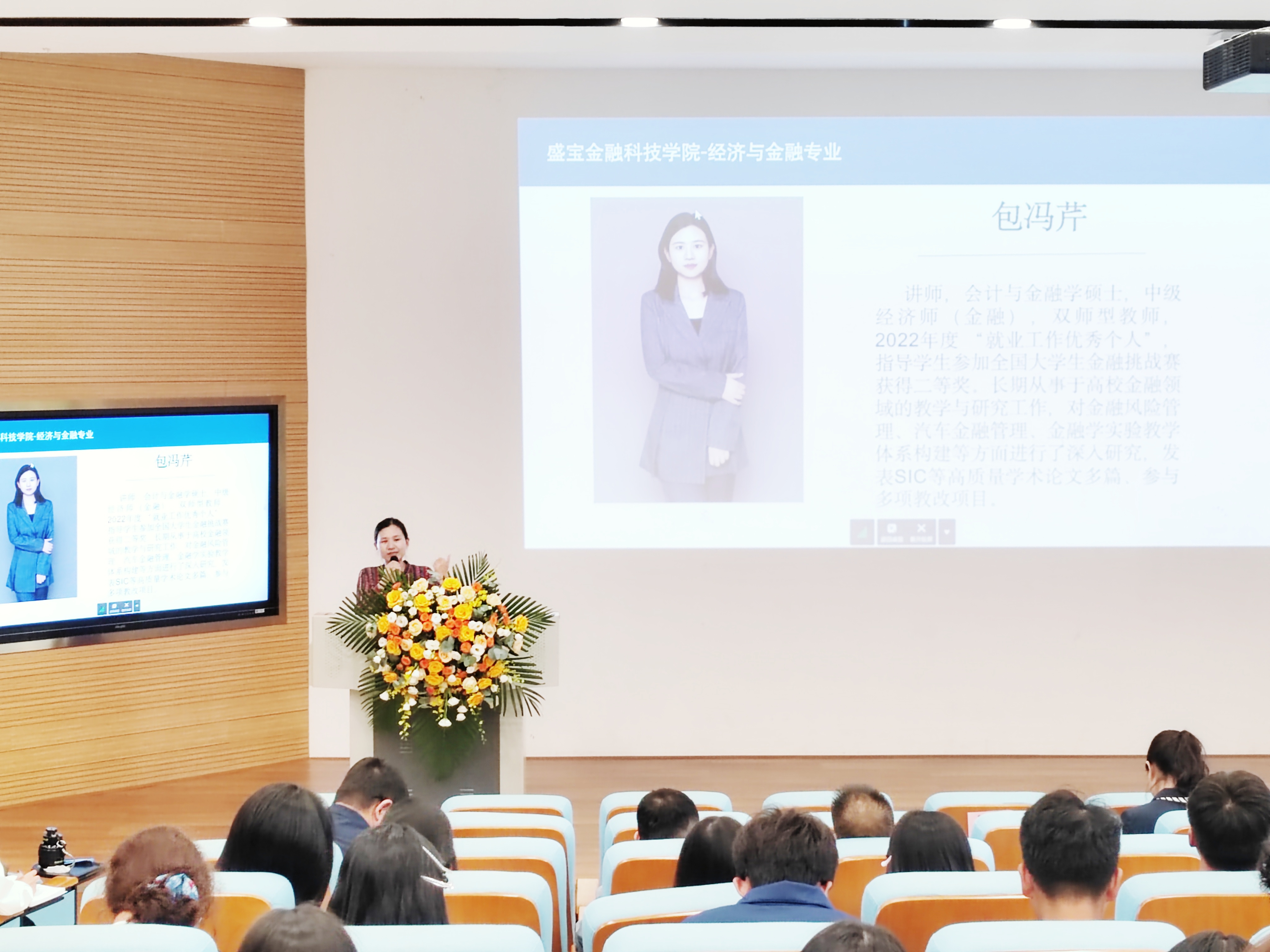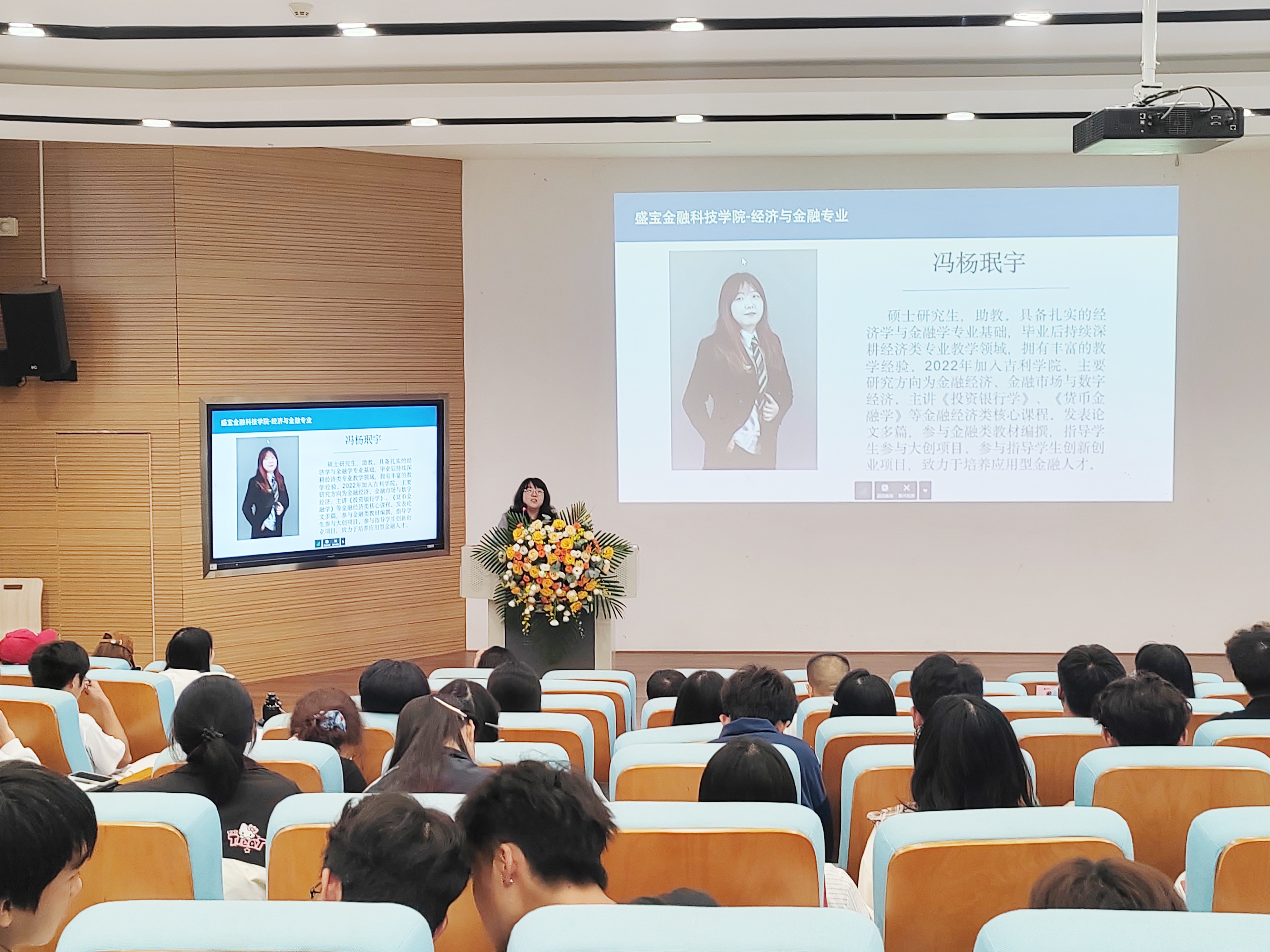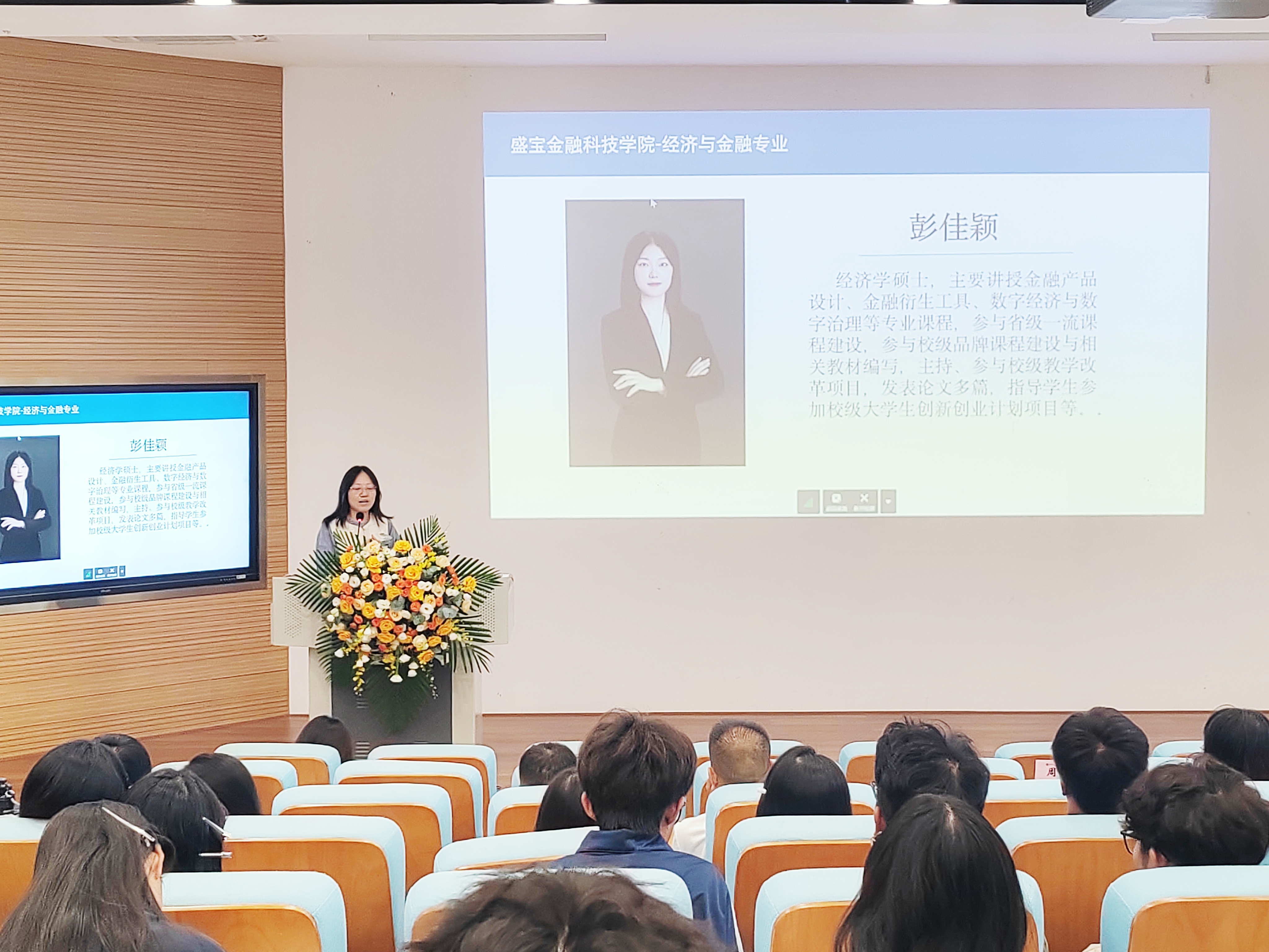 金融教研室教师黄宏、黄俊、包冯芹、陈方、李静、冯杨珉宇、彭佳颖、钟羽丰、刘诗小祺依次上台,对个人的主讲课程、研究方向、工作与实践经历等进行介绍,从学习、实践等多方面提出新生在未来四年个人成长的建议,表达了对新生的欢迎、鼓励与期待。